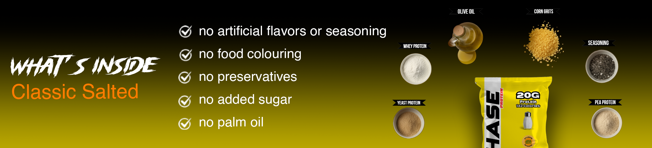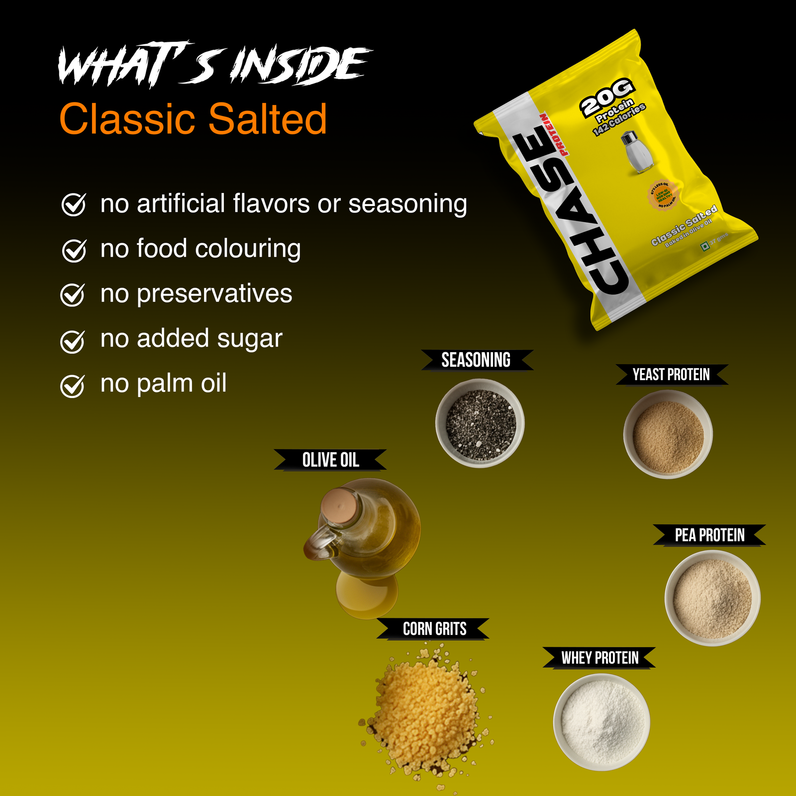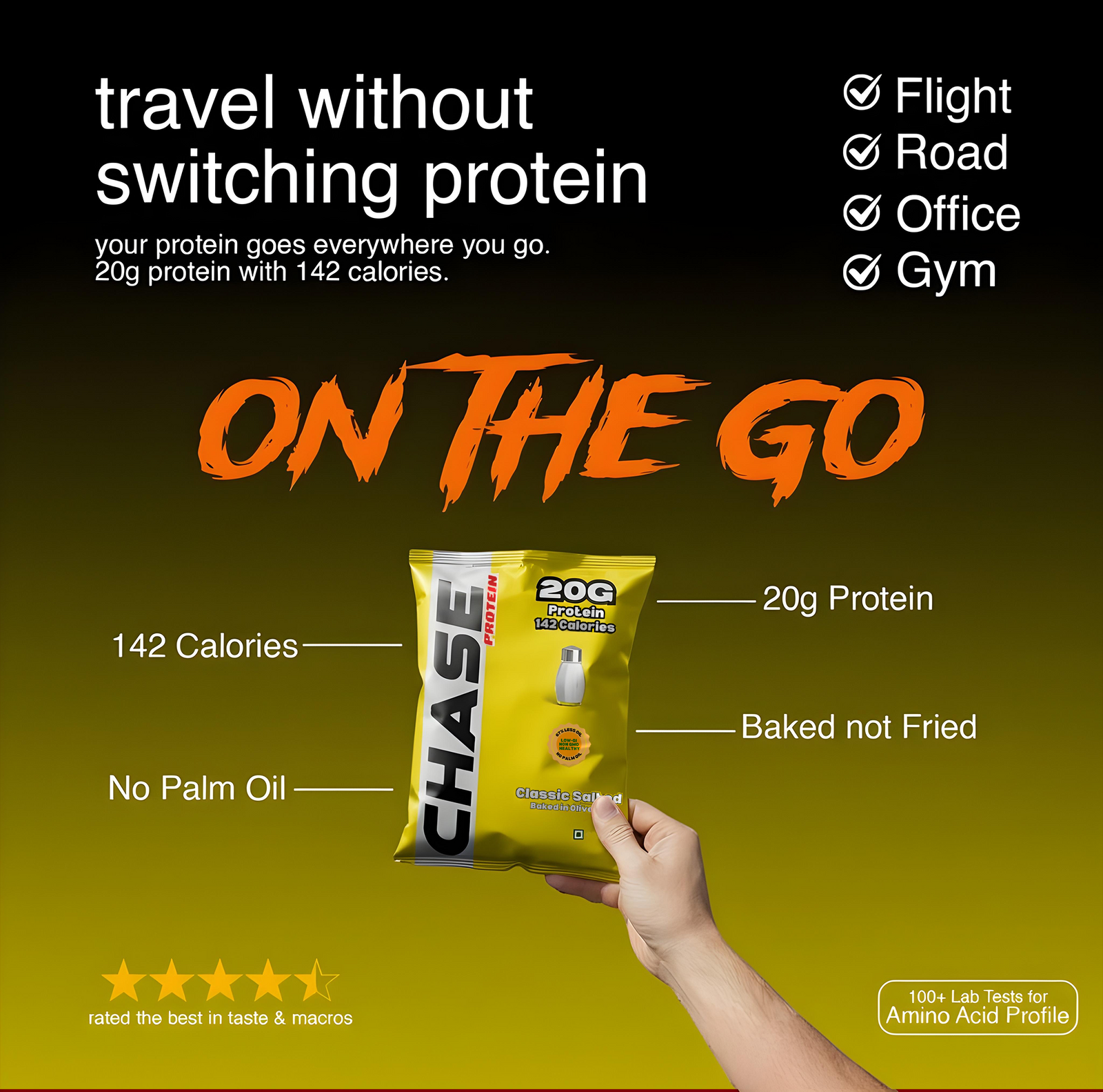 Chase Protein Kurkure (Classic Salted) bring together bold flavor and powerful nutrition, packing 20g of high-quality whey protein isolate in every pack to fuel muscle gain, recovery, and fitness goals. Baked in olive oil for a light, crispy crunch—not fried—these protein Kurkure are a clean, low-calorie alternative to unhealthy snacks. Made with the spicy, aromatic blend of Indian masala, they deliver a zesty, mouth-watering taste that makes healthy snacking exciting. With added fiber to curb hunger, aid digestion, and keep you fuller for longer, these protein-rich Kurkure are perfect for gym-goers, athletes, busy professionals, or anyone looking for a wholesome pre- or post-workout snack that fits seamlessly into an active lifestyle.
