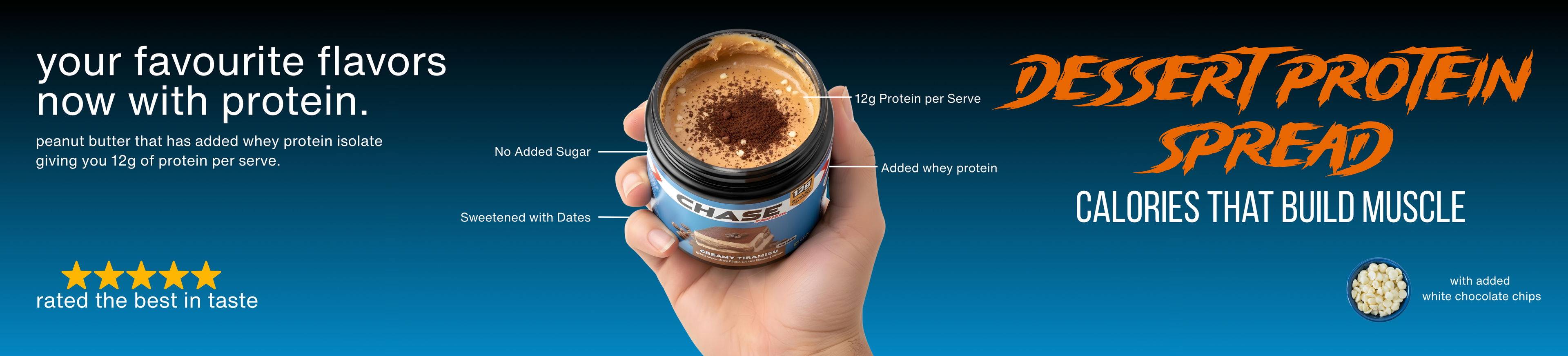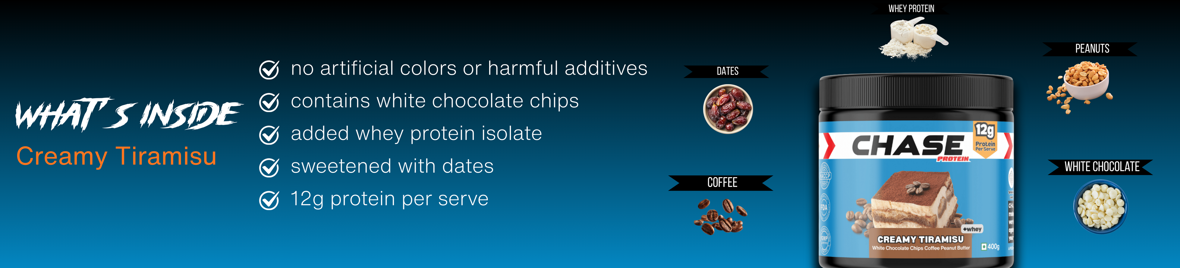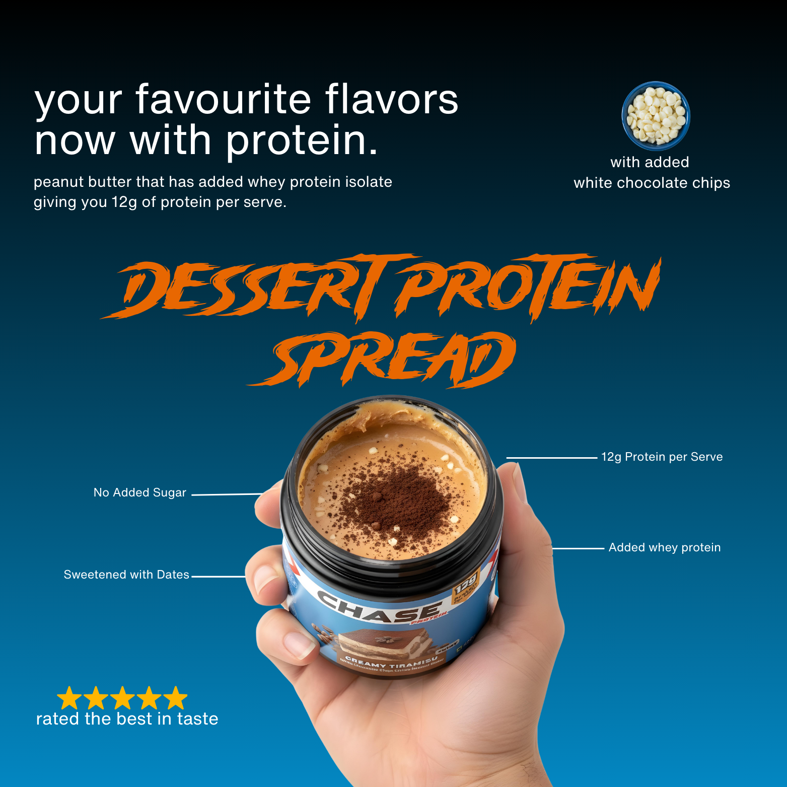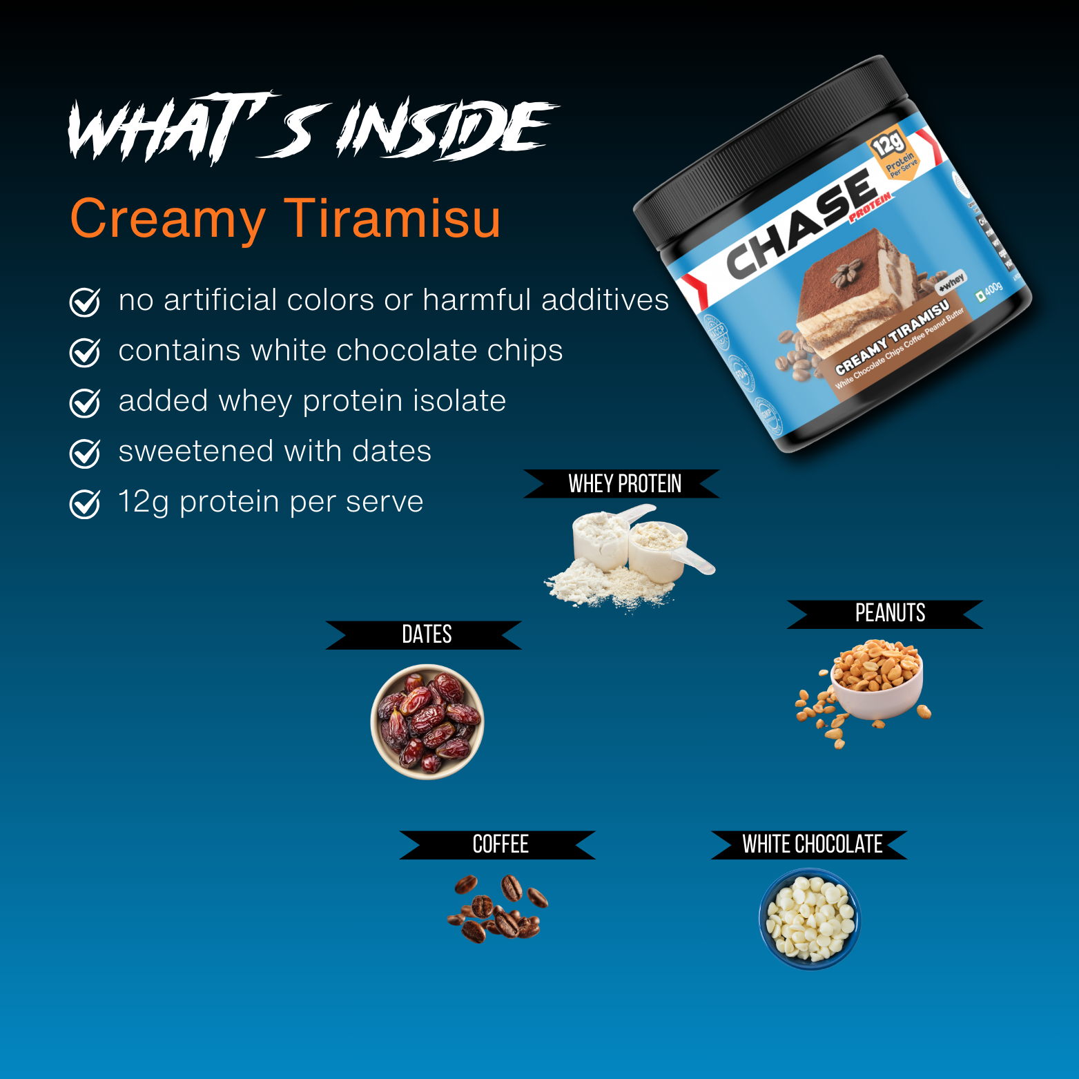 Chase Protein Creamy Tiramisu Peanut Butter is a creamy, indulgent peanut butter topped with white chocolate chunks. Made with whey protein isolate, it delivers 12g protein per serving, contains no added sugar, and is sweetened with dates, making it a clean, high-protein spread.