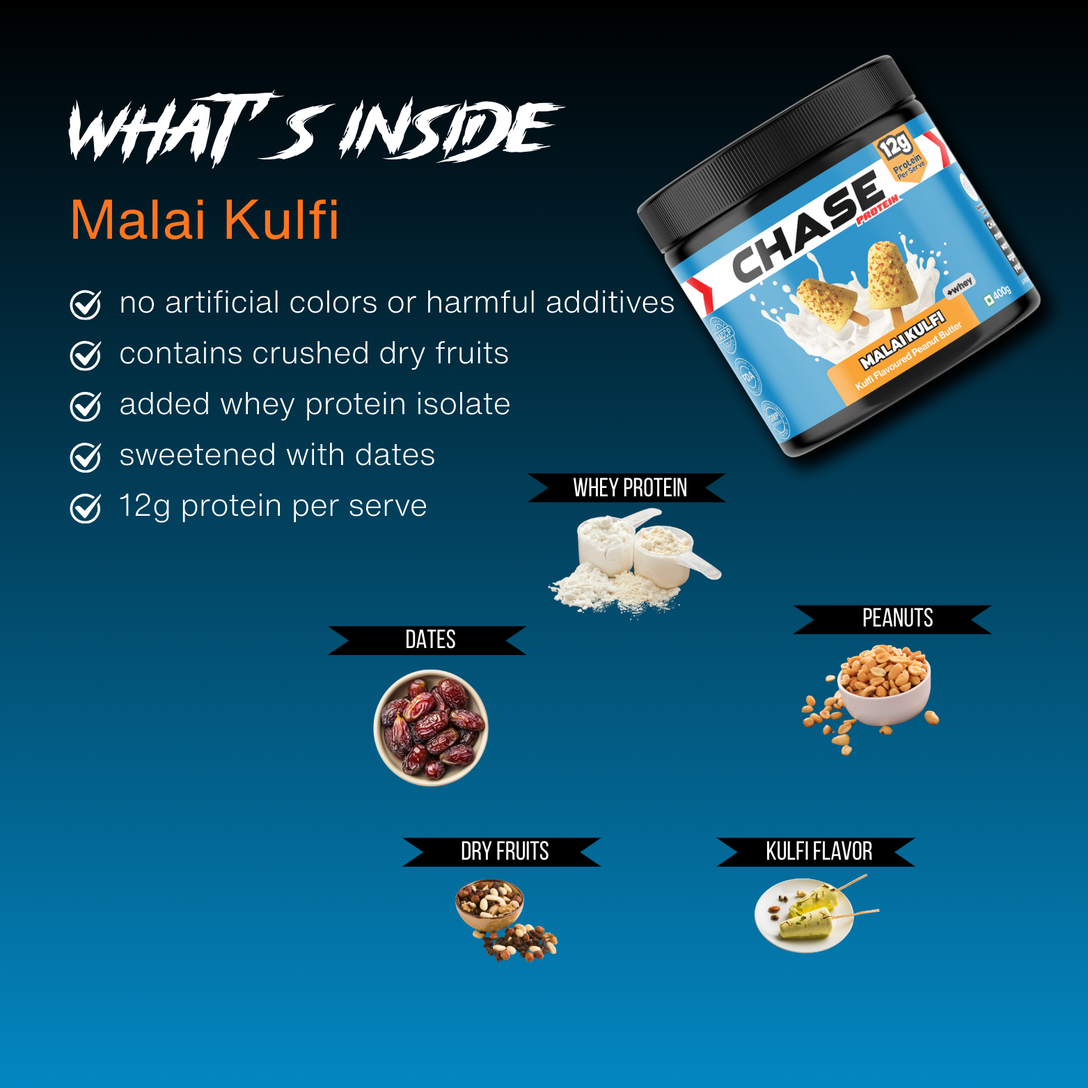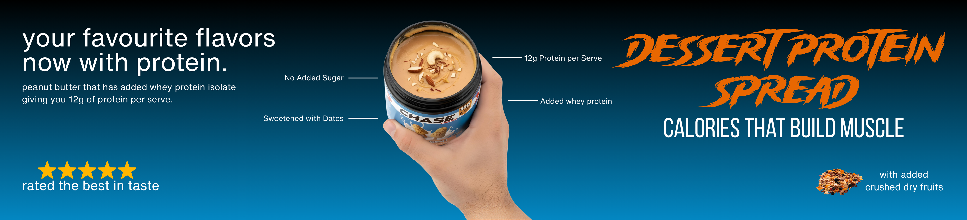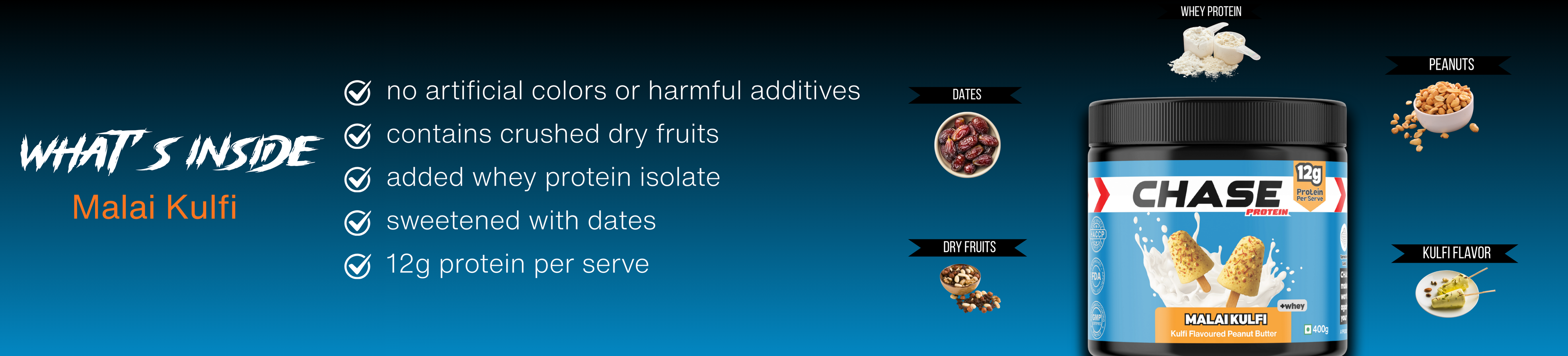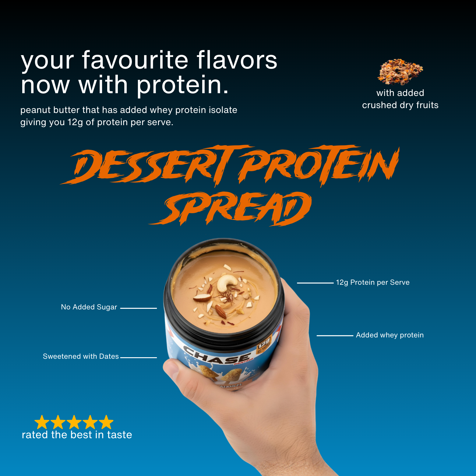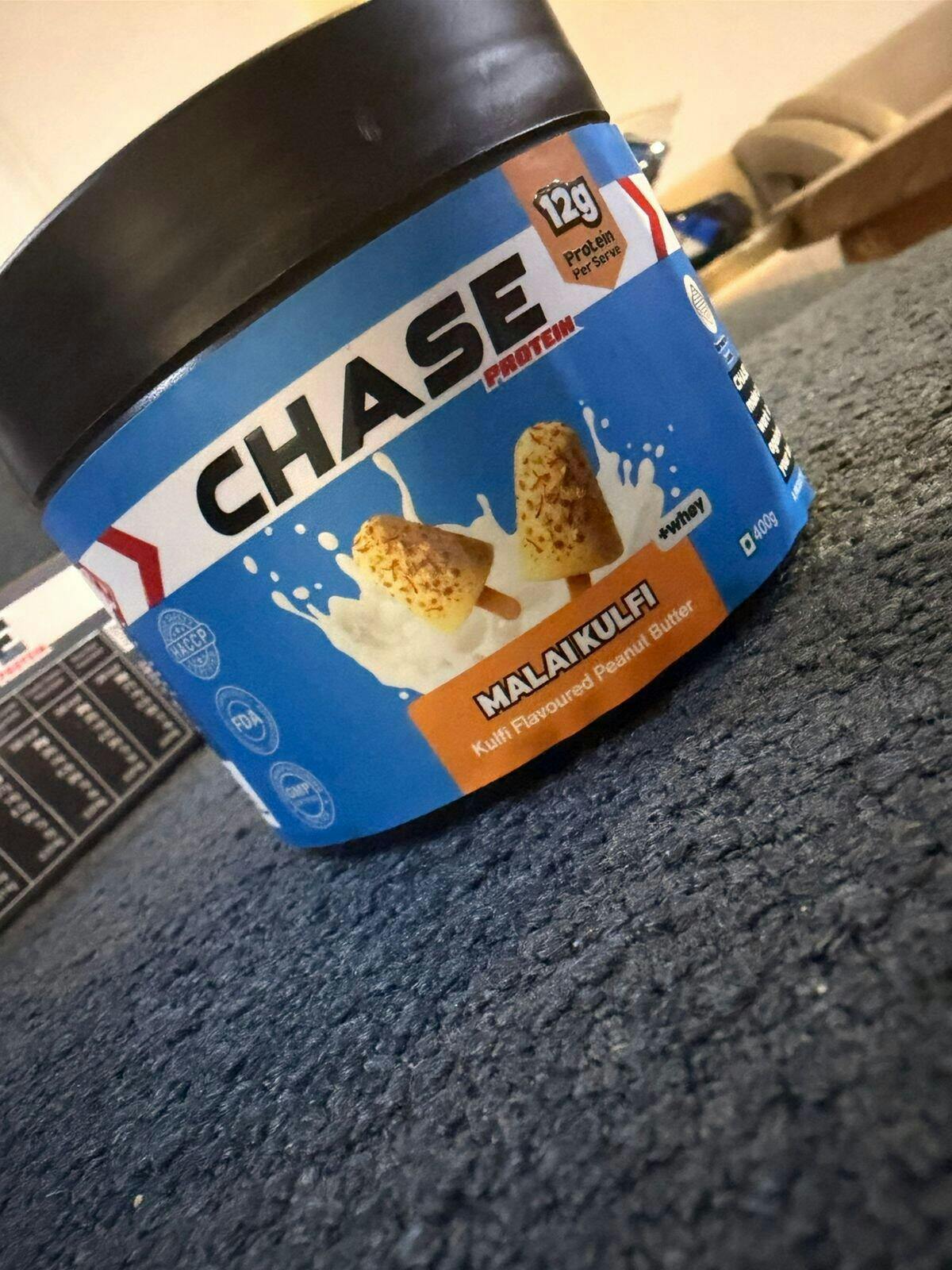 Chase Protein Malai Kulfi Peanut Butter is a creamy, indulgent peanut butter topped with kesar and pista chunks. Made with whey protein isolate, it delivers 12g protein per serving, contains no added sugar, and is sweetened with dates, making it a clean, high-protein spread.