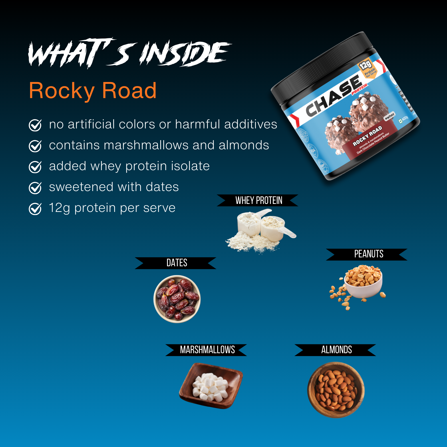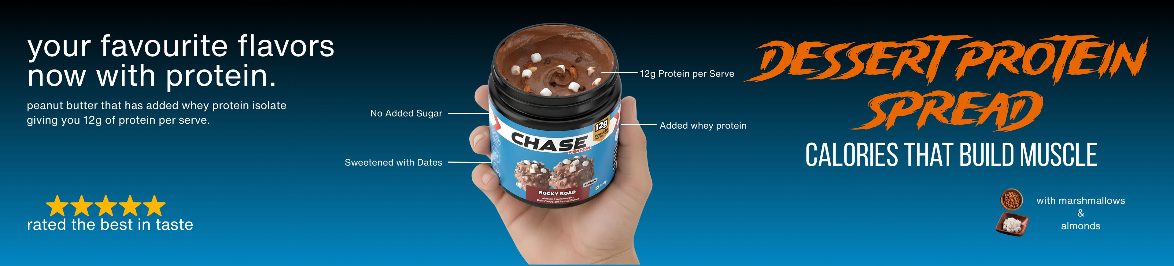 Protein Rocky Road Peanut Butter is a creamy, indulgent peanut butter topped with marshmallows and almond chunks. Made with whey protein isolate, it delivers 12g protein per serving, contains no added sugar, and is sweetened with dates, making it a clean, high-protein spread.