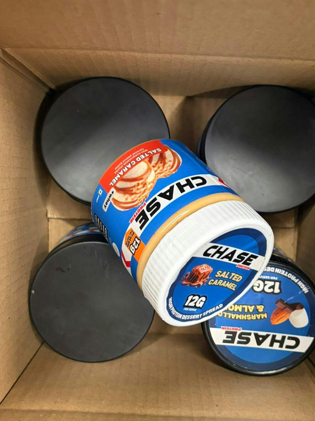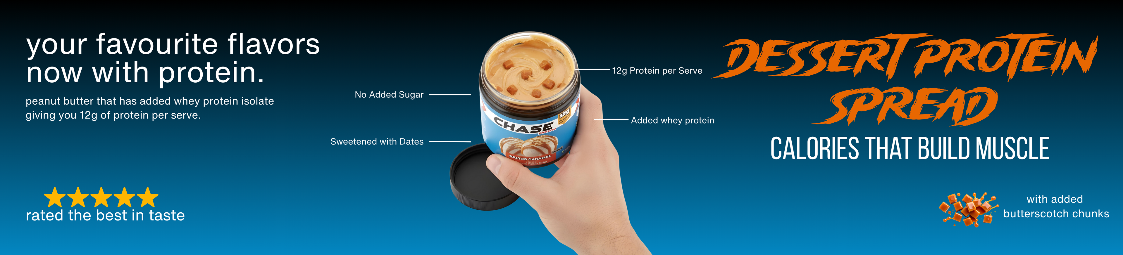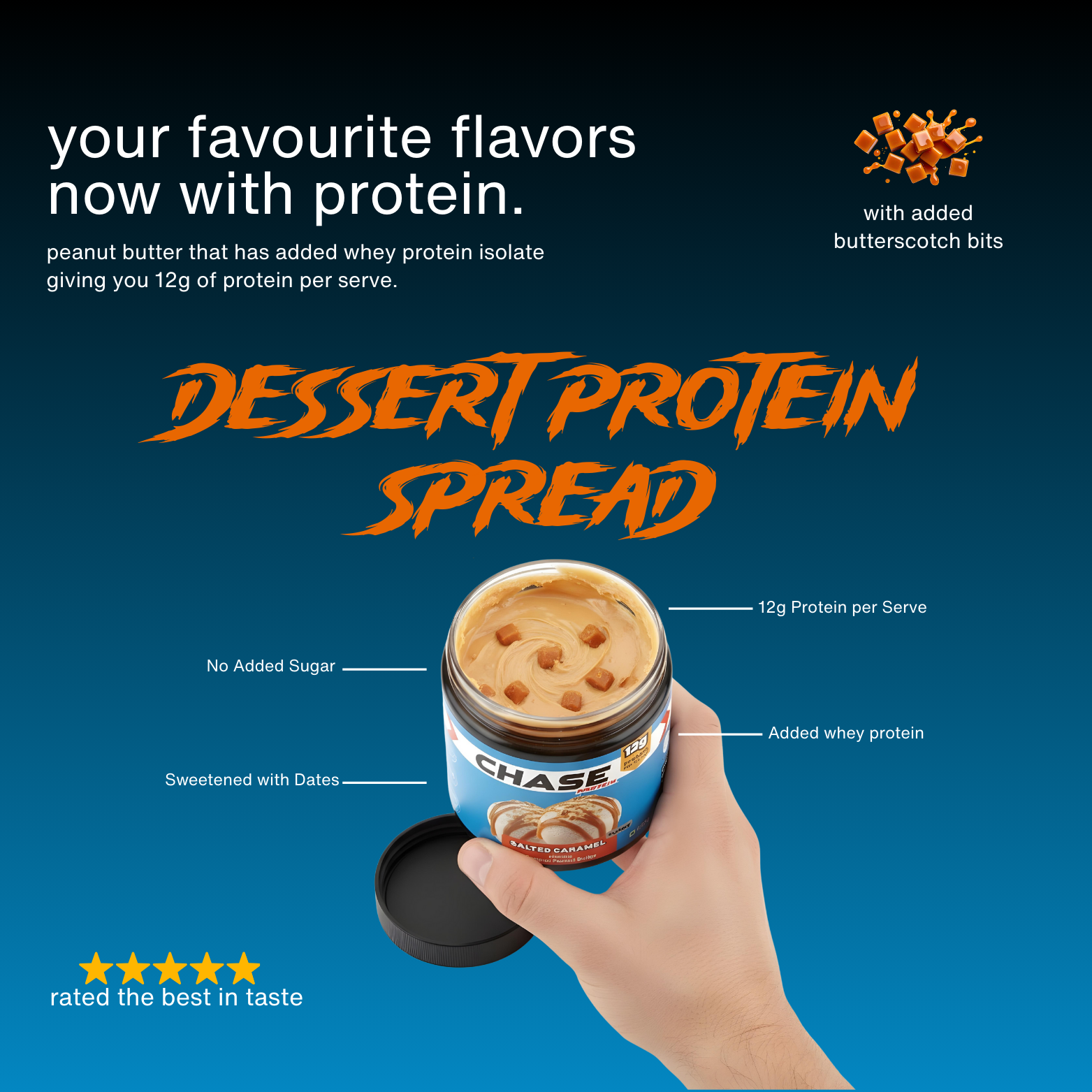 Chase Protein Salted Caramel Peanut Butter is a creamy, indulgent peanut butter topped with butterscotch bits. Made with whey protein isolate, it delivers 12g protein per serving, contains no added sugar, and is sweetened with dates, making it a clean, high-protein spread.