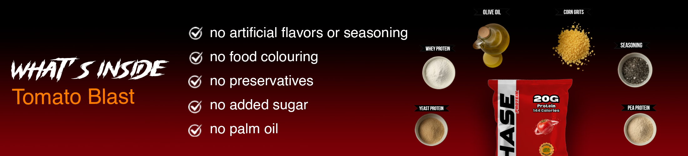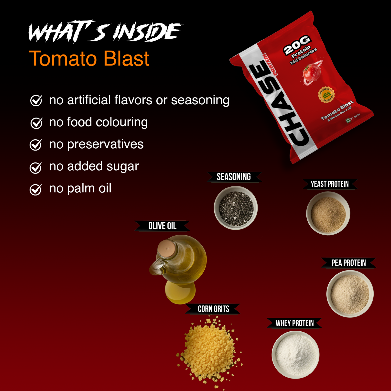 Chase Protein Kurkure (Tomato Kurkure) bring together bold flavor and powerful nutrition, packing 20g of high-quality whey protein isolate in every pack to fuel muscle gain, recovery, and fitness goals. Baked in olive oil for a light, crispy crunch—not fried—these protein Kurkure are a clean, low-calorie alternative to unhealthy snacks. Made with the spicy, aromatic blend of Indian masala, they deliver a zesty, mouth-watering taste that makes healthy snacking exciting. With added fiber to curb hunger, aid digestion, and keep you fuller for longer, these protein-rich Kurkure are perfect for gym-goers, athletes, busy professionals, or anyone looking for a wholesome pre- or post-workout snack that fits seamlessly into an active lifestyle.